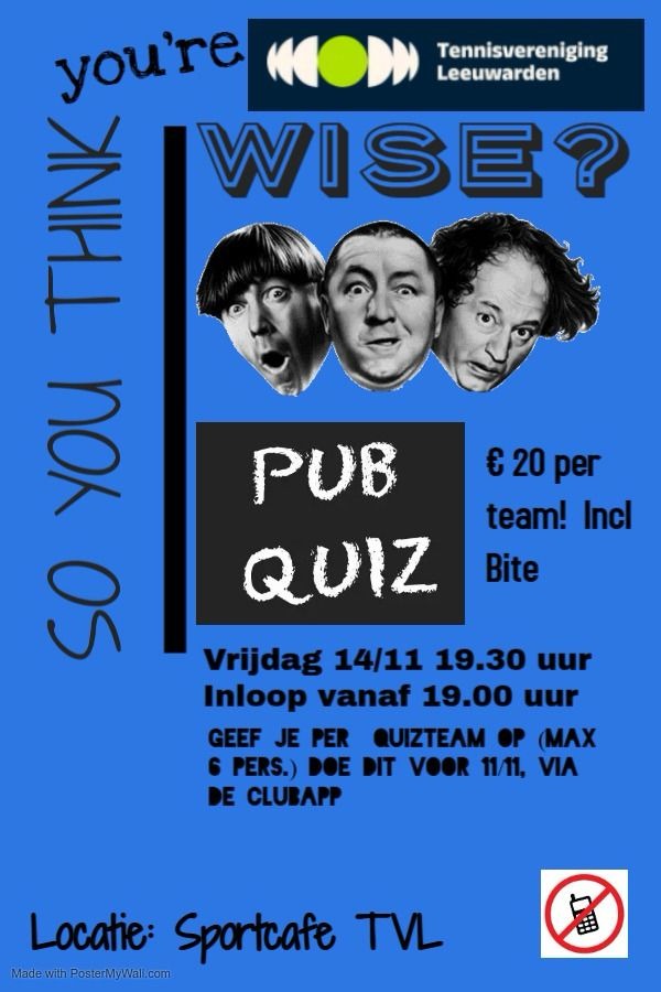 Laat je clubgenoten versteld staan van jullie kennis en geef je met je team op voor de gezellige pubquiz (max. 6 personen). 1 aanmelding per team is genoeg.